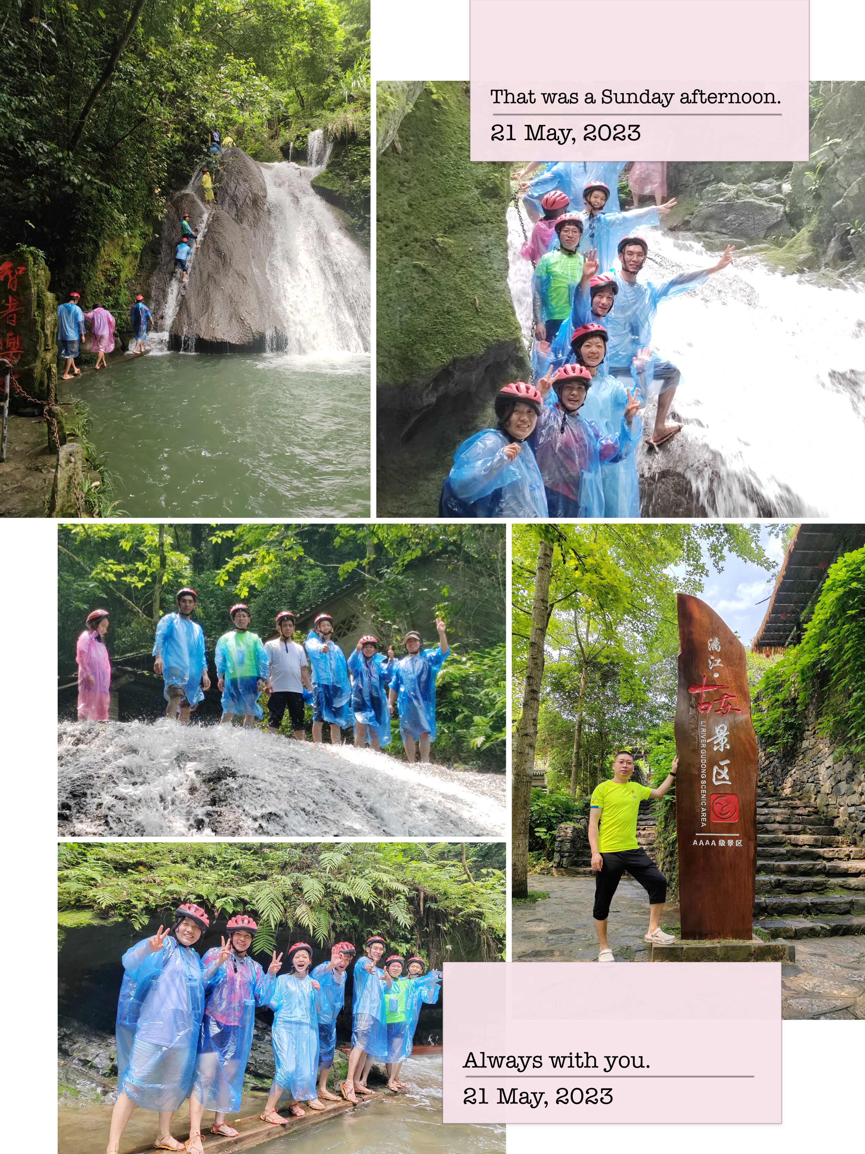 第二天,我們出發“古東森林瀑布”——它是登山探險、森林尋幽之佳境。踩著草鞋、身著淺藍色雨衣的我們各個神采奕奕,抱著忐忑的心情,在同伴的鼓勵下,所有人都成功登上了瀑布。